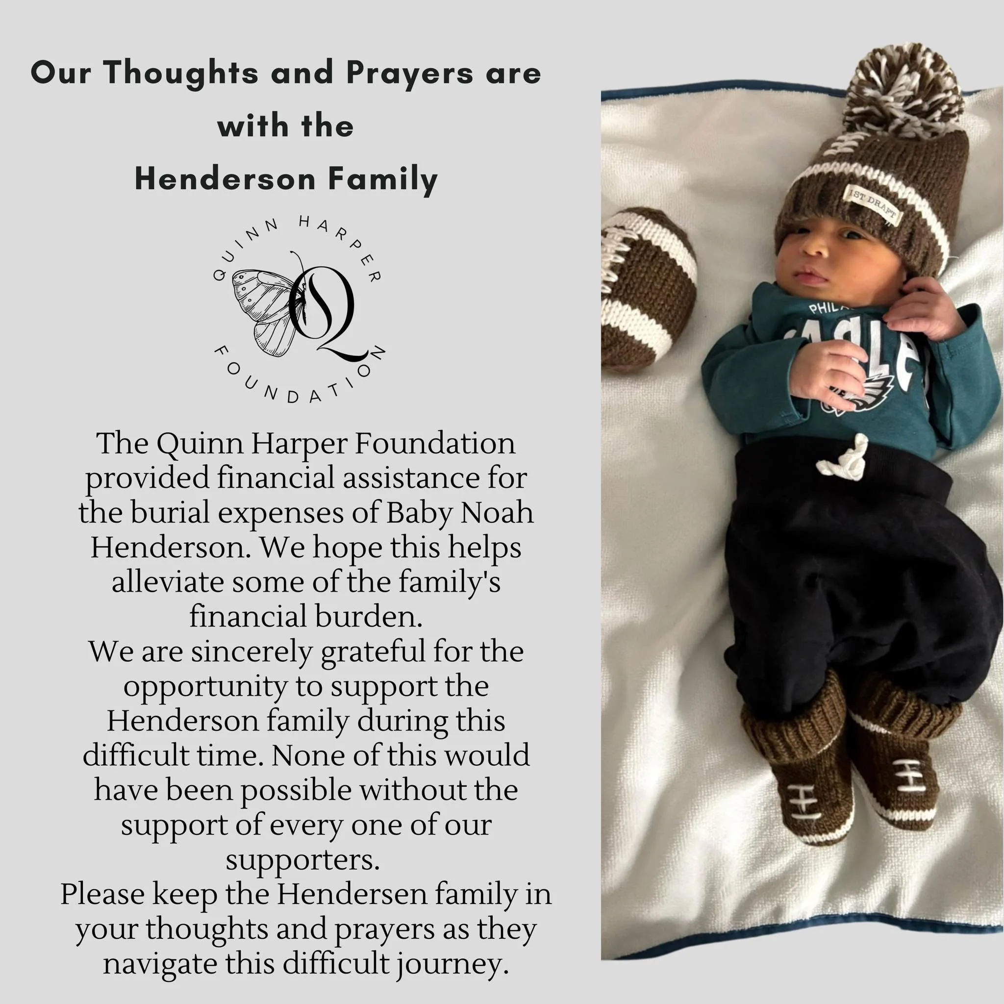 The Quinn Harper Foundation was established in April of 2024 and in October 2024 we were able to help our first family. This family lost their two-week-old son (KJC), using initials to protect the family’s privacy. The foundation was able to provide financial support for the cremation and urn for the baby.